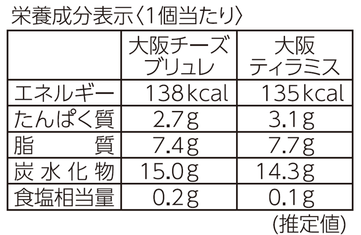 | 内容量 | 大阪チーズブリュレ(チーズケーキ60g、カラメルクラッシュ2g)×2 個 大阪ティラミス(ティラミス61g、ココアパウダー0.8g)×2 個 |